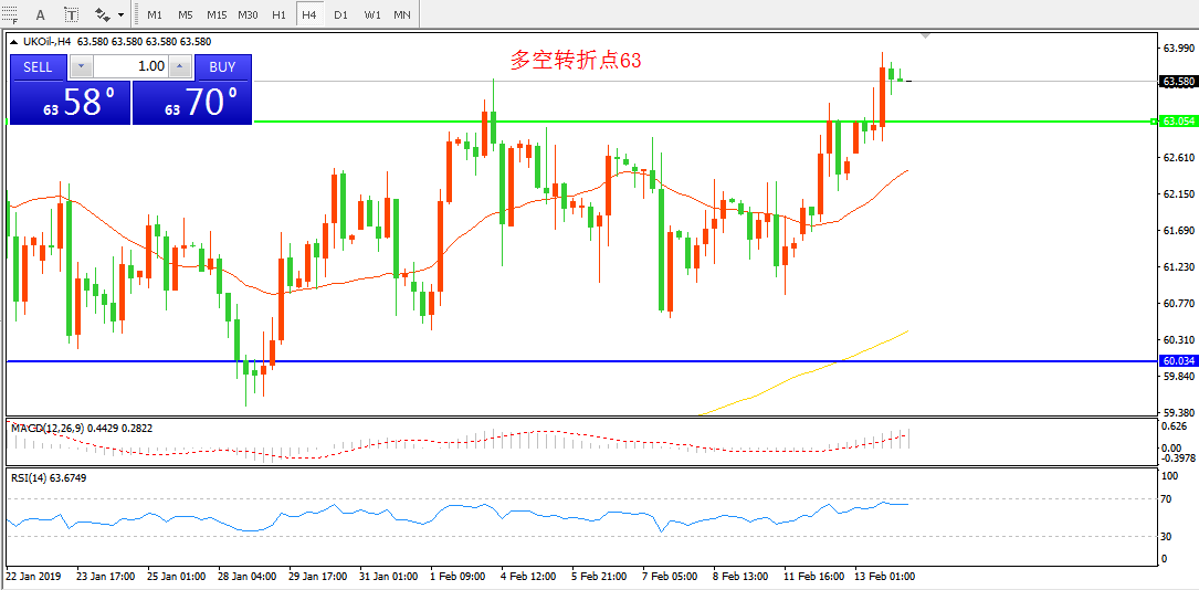 4小时图看,油价窄幅震荡后突破63美元阻力, 短期均线逐渐拐头, MACD红柱增加,短期延续上行可能较大。