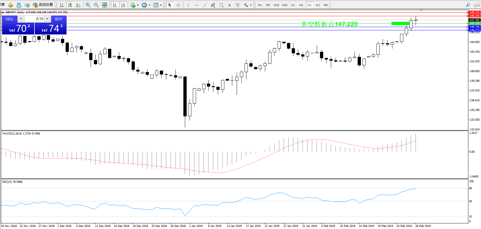 交易策略:147.220上方看涨,目标148.243、148.731