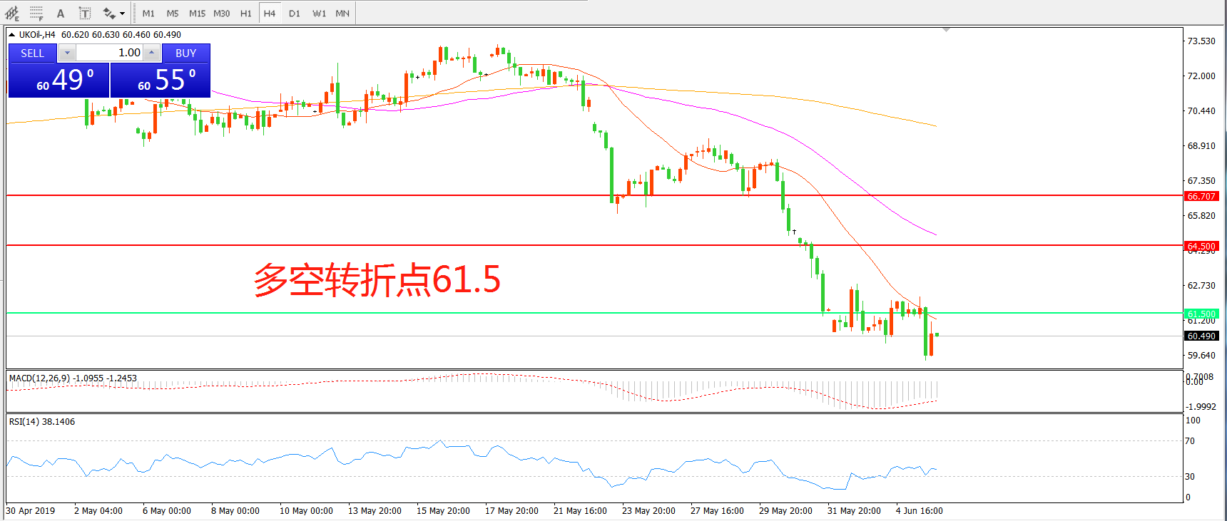 交易策略: 在61.50之下看跌,目标57.50     53.00