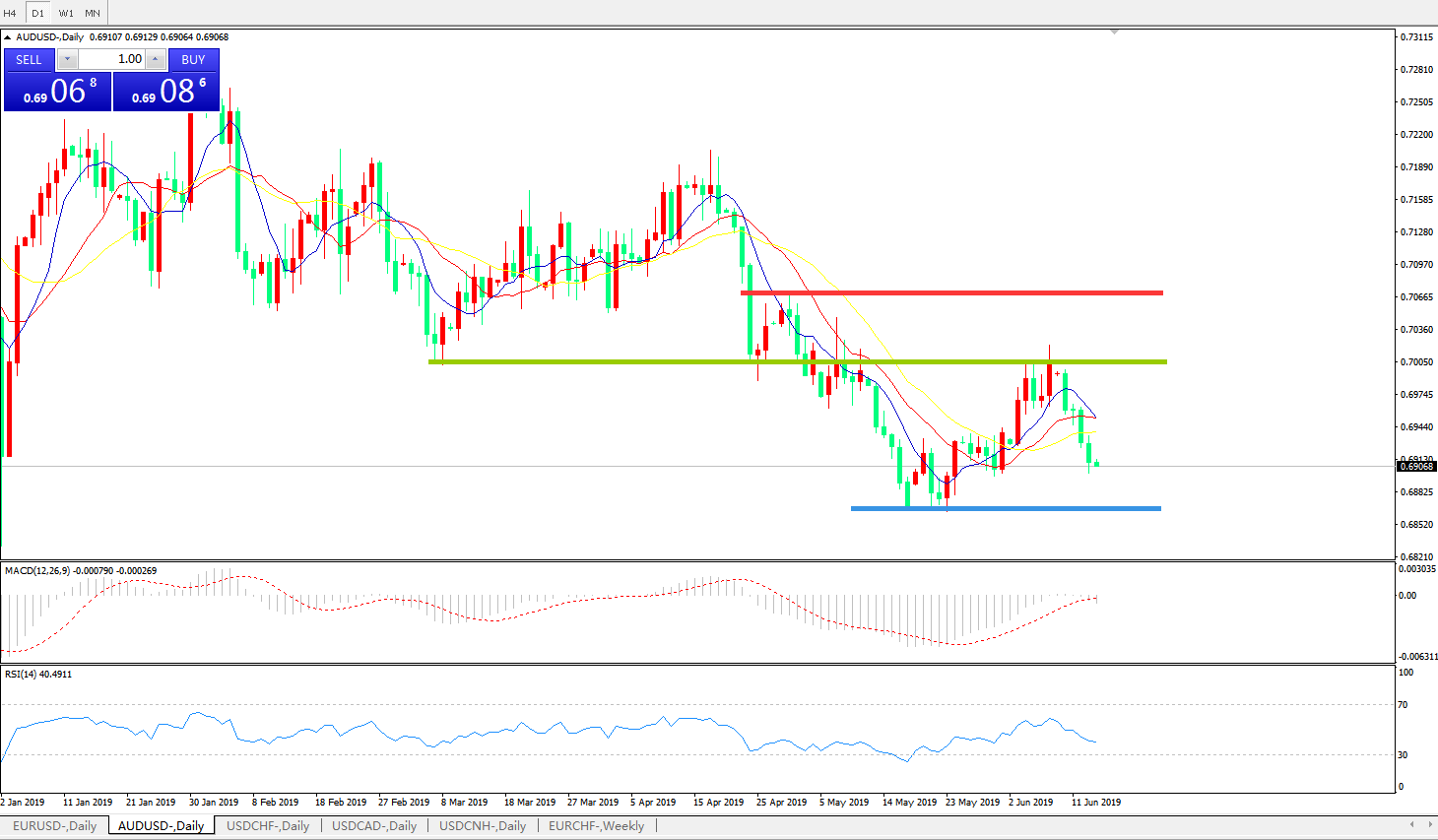 技术面简析:日图均线粘合有形成死叉迹象,价格持续回落,MACD在0轴下方有放量迹象,RSI持续走低,预计汇价将继续走低试探前低。