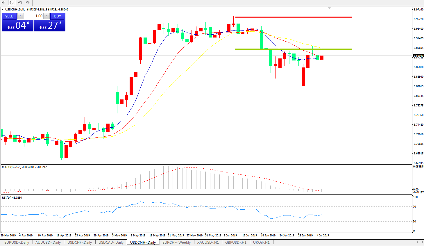 交易策略6.9000之下,看跌,目标价位为6.8100,然后为6.7600