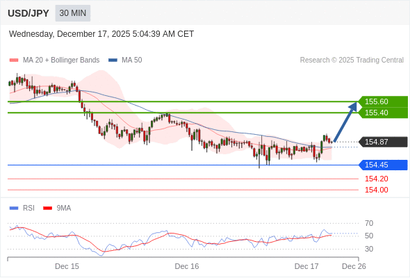 在 154.45 之上,看涨,目标价位为 155.40 ,然后为 155.60 。