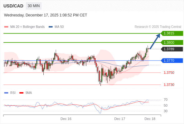 在 1.3770 之上,看涨,目标价位为 1.3800 ,然后为 1.3815 。