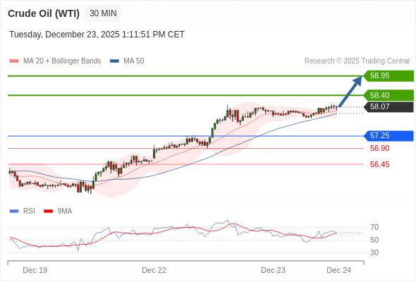 在 57.25 之上,看涨,目标价位为 58.40 ,然后为 58.95 。
