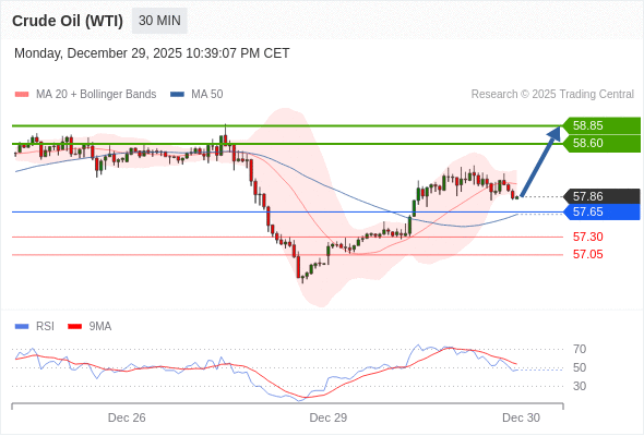 在 57.65 之上,看涨,目标价位为 58.60 ,然后为 58.85 。