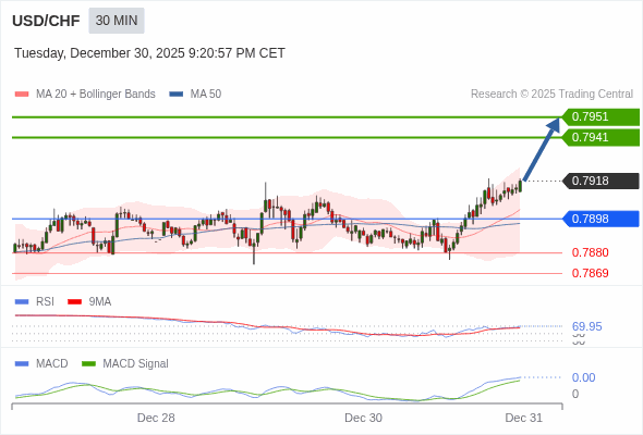 美元/瑞郎 当日内 : 看涨,当 0.7898 为支撑位。