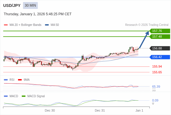 美元/日元 当日内 : 看涨,当 156.42 为支撑位,目标定在157.76。