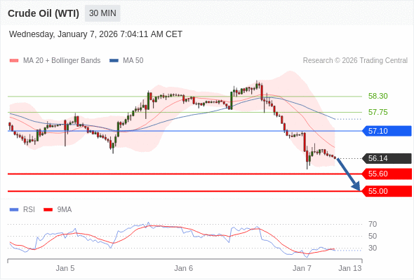 在 57.10 之下,看跌,目标价位为 55.60 ,然后为 55.00 。