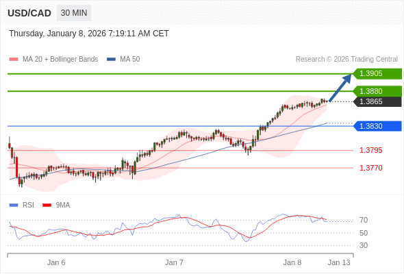 在 1.3830 之上,看涨,目标价位为 1.3880 ,然后为 1.3905 。