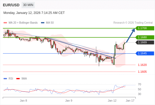 在 1.1645 之上,看涨,目标价位为 1.1680 ,然后为 1.1700 。
