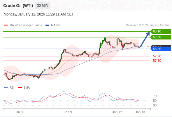在 58.55 之上,看涨,目标价位为 59.60 ,然后为 60.10 。