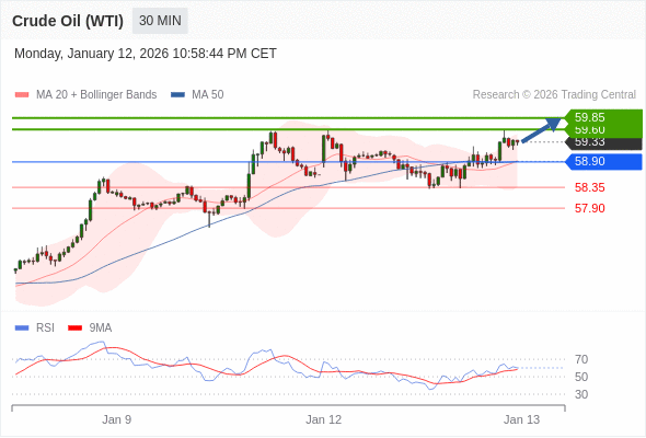 在 58.90 之上,看涨,目标价位为 59.60 ,然后为 59.85 。
