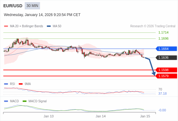 欧元/美元 当日内 : 看跌,在 1.1664 之下。