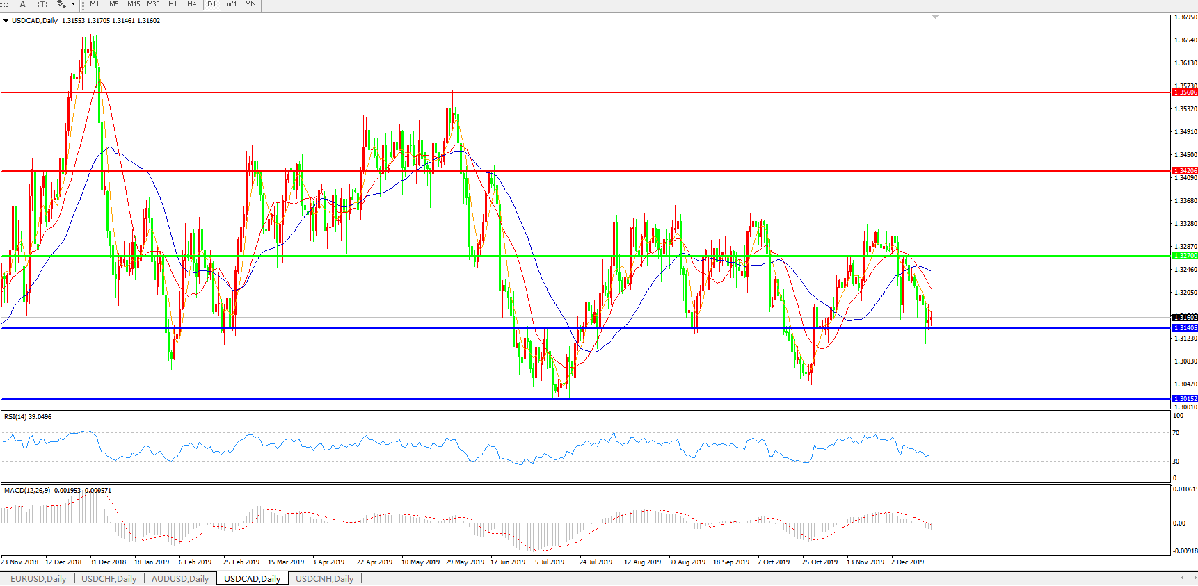 技术面简析:日线图均线呈空头排列,汇价持续震荡走弱逼近1.3140关口,MACD下穿0轴且量能0轴下方微放量,RSI震荡走低,短期汇价需关注1.3140附近支撑,预计汇价存进一步下行空间。