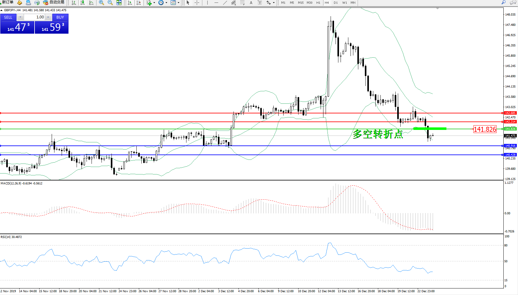 交易策略:141.826下方看跌,目标140.916、140.428