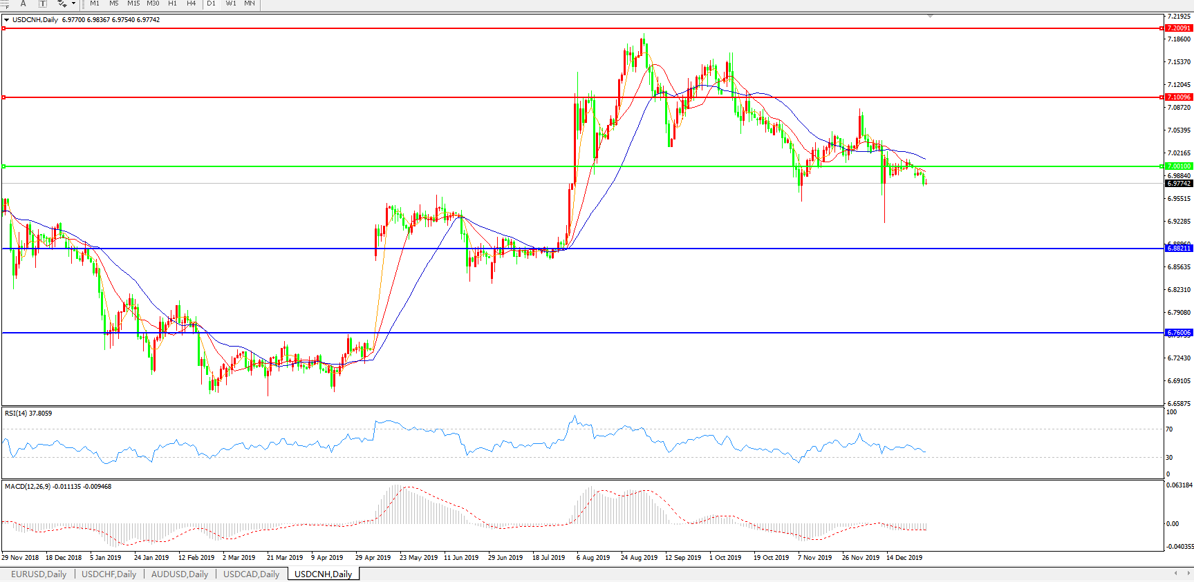 交易策略: 在7.0000之下,看跌,目标价位为6.8820,然后为6.7600。