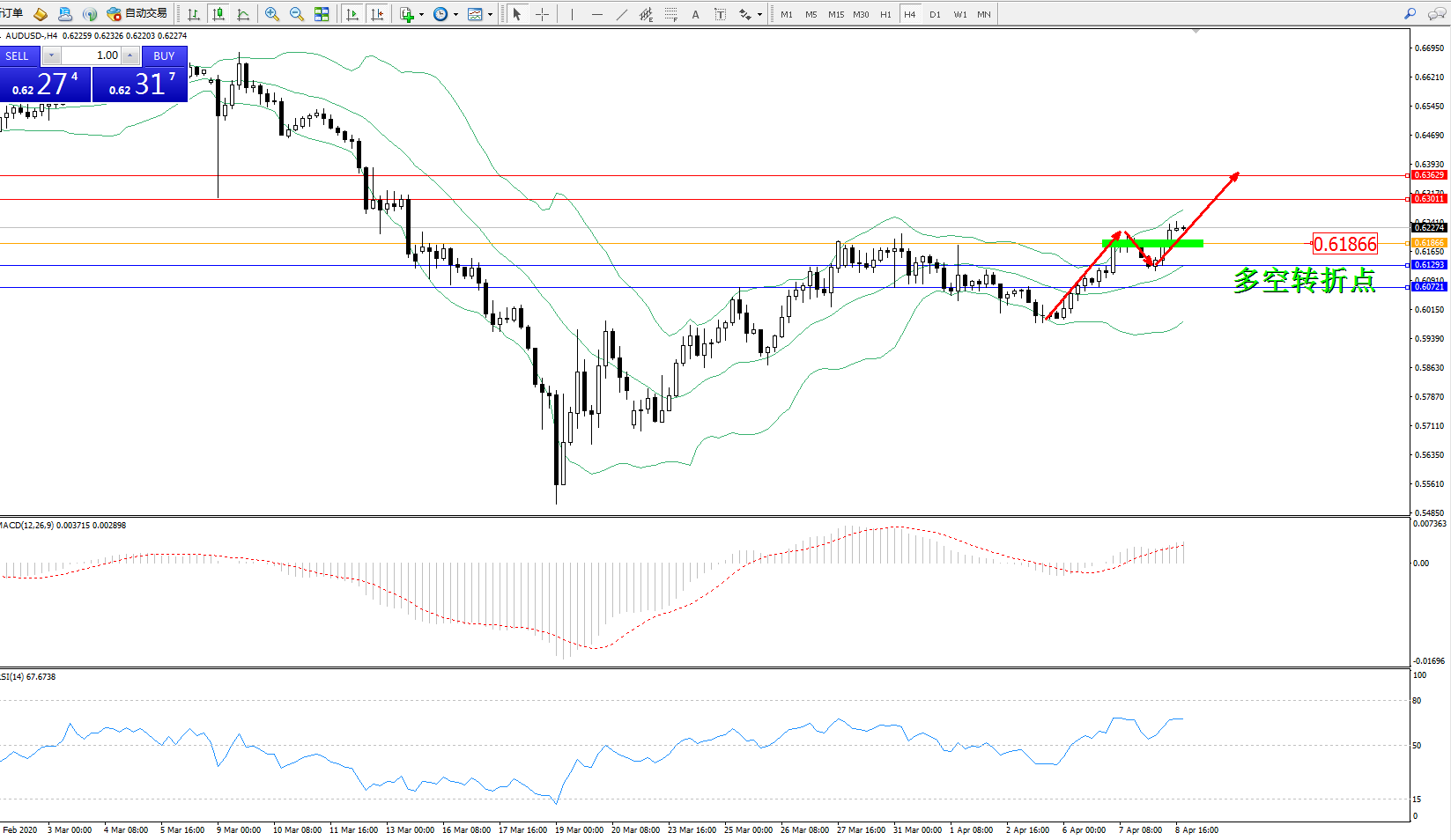 澳元美元AUDUSD——4小时K线图显示: