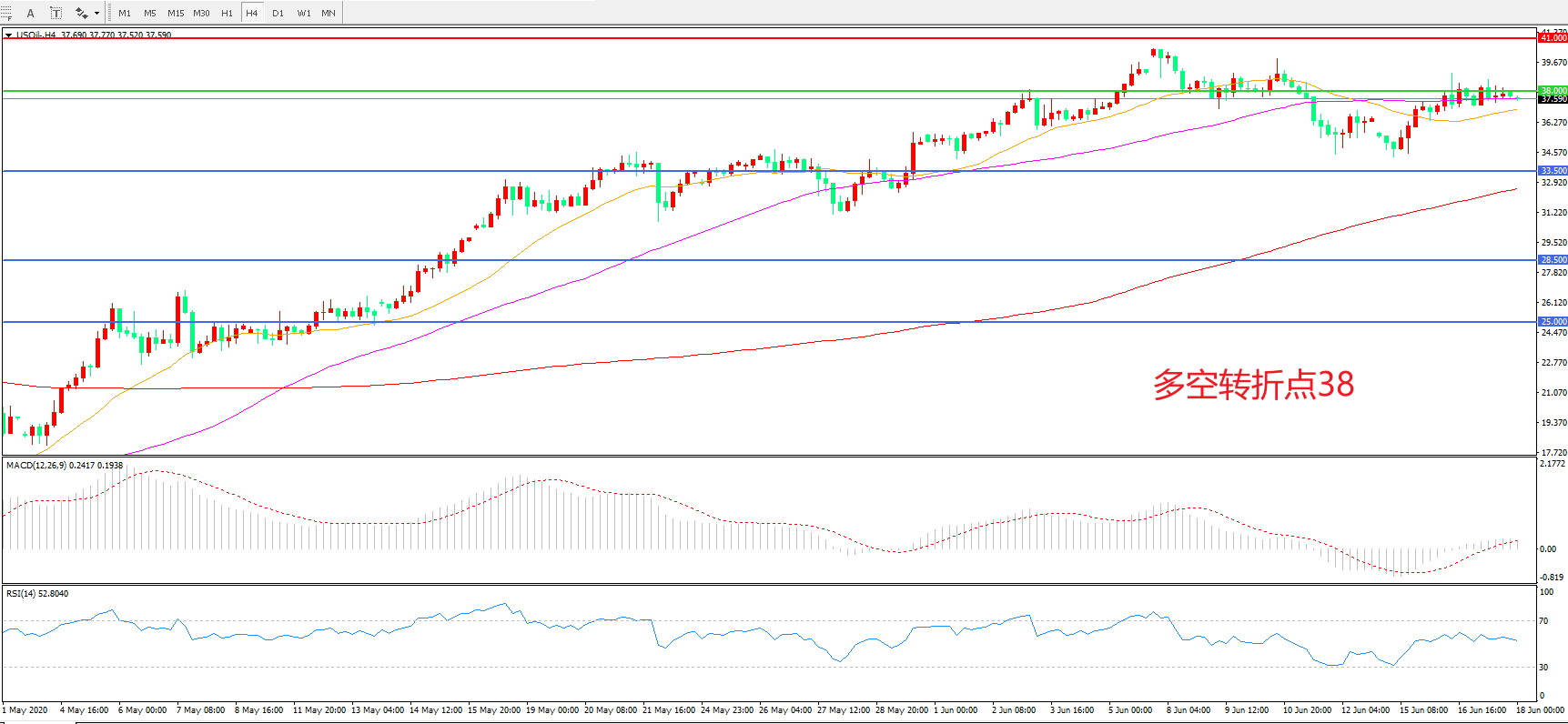 4小时图看,油价呈现窄幅震荡形态,38美元成为短期阻力,均线系统逐渐粘合,MACD绿柱缩短,RSI指标走平,日内延续震荡概率较大。