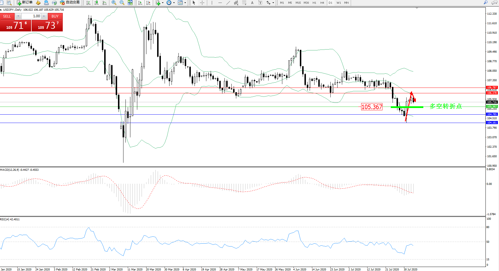 交易策略:105.367上方看涨,目标106.378、106.787