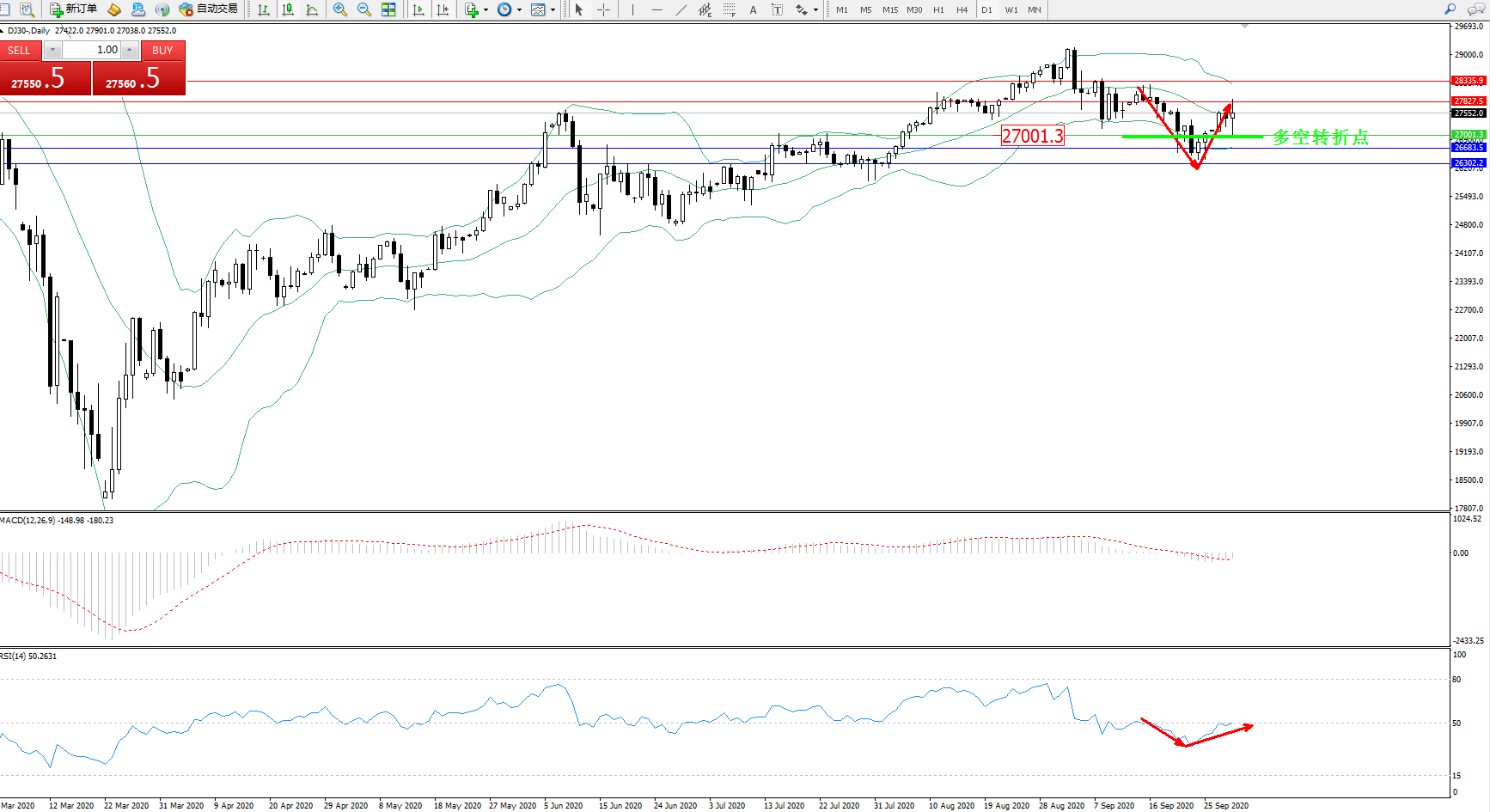 道琼斯指数9月30日(周三)收盘上涨329.00点,涨幅1.20%,报27781.70点。自5月经济复苏开始以来,ADP就业数据与非农就业人数的相关性在五个月里大幅下降,因此对市场的影响已经减弱;9月份ADP为74.9万,非农报告估计为85万,可能代表着这两个美国就业数据之间的历史历史的回归。但即使9月份的数据最终达成一致,也需要一个月或几个月的时间,直到市场相信率先于周三发布的ADP就业报告能够预判周五发布的非农报告。美国首场总统候选人辩论没有为债券和外汇市场提供任何交易线索,下个季度美元将继续疲软;旦美国民主党候选人拜登顺利当选,其财政政策将继而利空美元,并利多欧系货币,原因在于其就任后可能考虑对富有阶层增加税收,并增加财政支出和赤字力度,这将会迫使资本从美国市场外流,而欧洲市场将成为资金的主要去向。