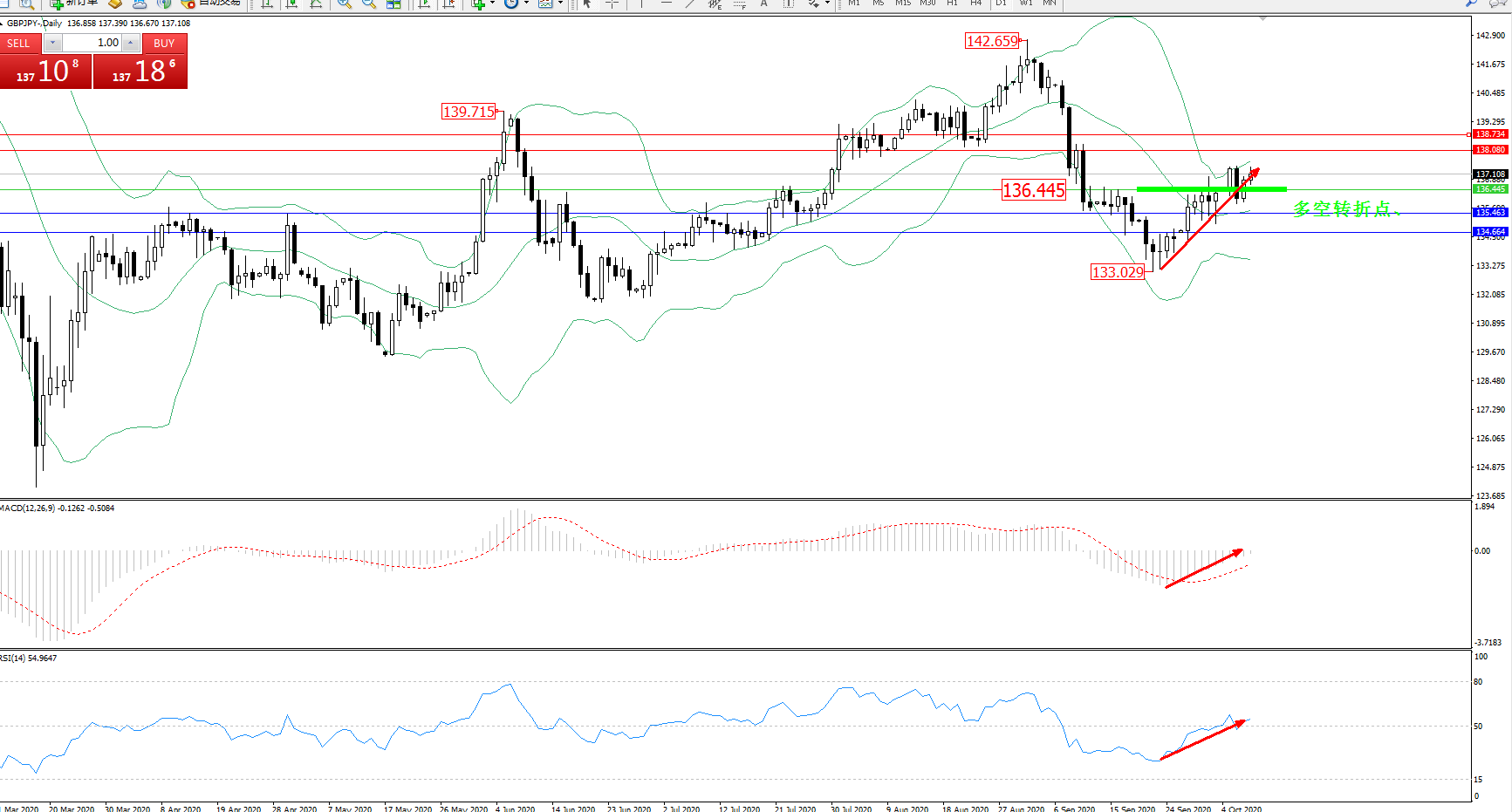 备选策略:136.445上方看涨,目标138.080、138.734