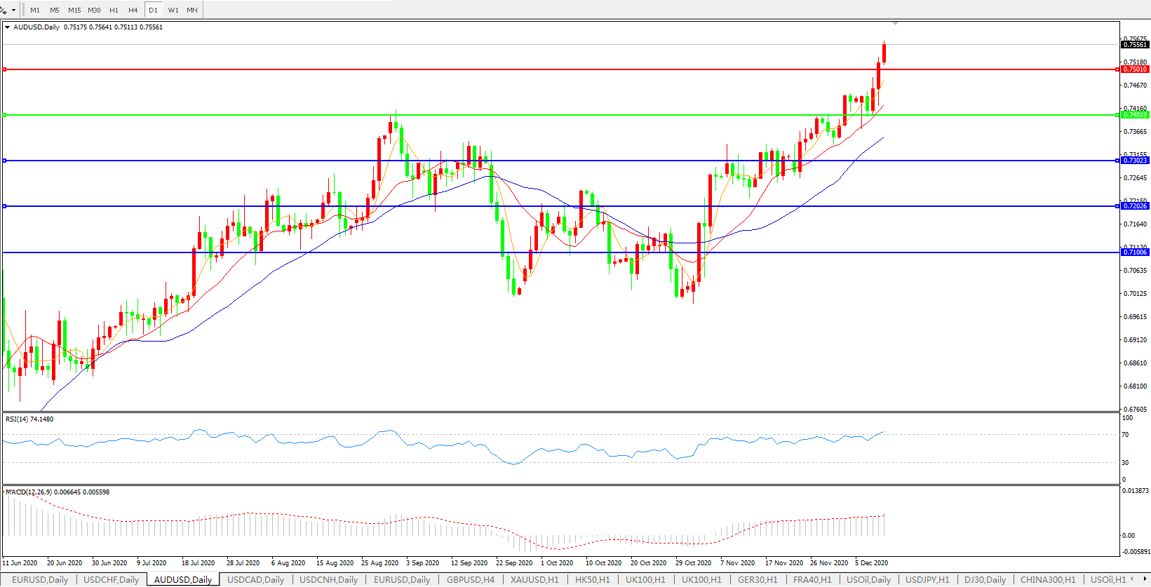 交易策略:0.7400上方看涨,目标0.7500、0.7600
