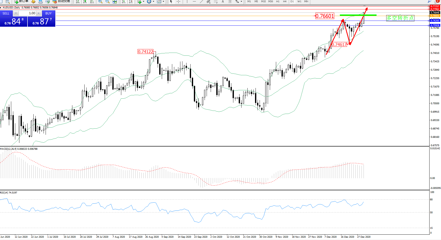 交易策略:0.76601上方看涨,目标0.77062、0.77257