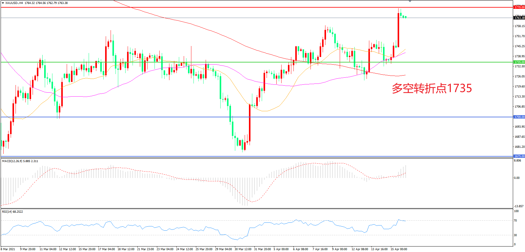 4小时图看,金价长阳拉升,突破前期整理区间,短期走势偏强,1770成为上方阻力,1735成为多空分水岭,MACD红柱增加,RSI指标走平,日内震荡上行概率较大。