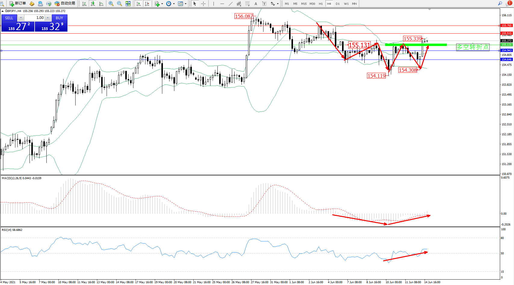 交易策略:155.131上方看涨,目标155.515、155.765