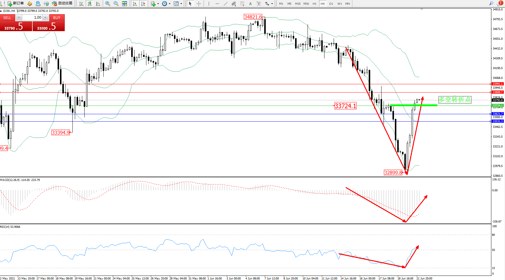 道琼斯指数DJ30——4小时K线图显示: