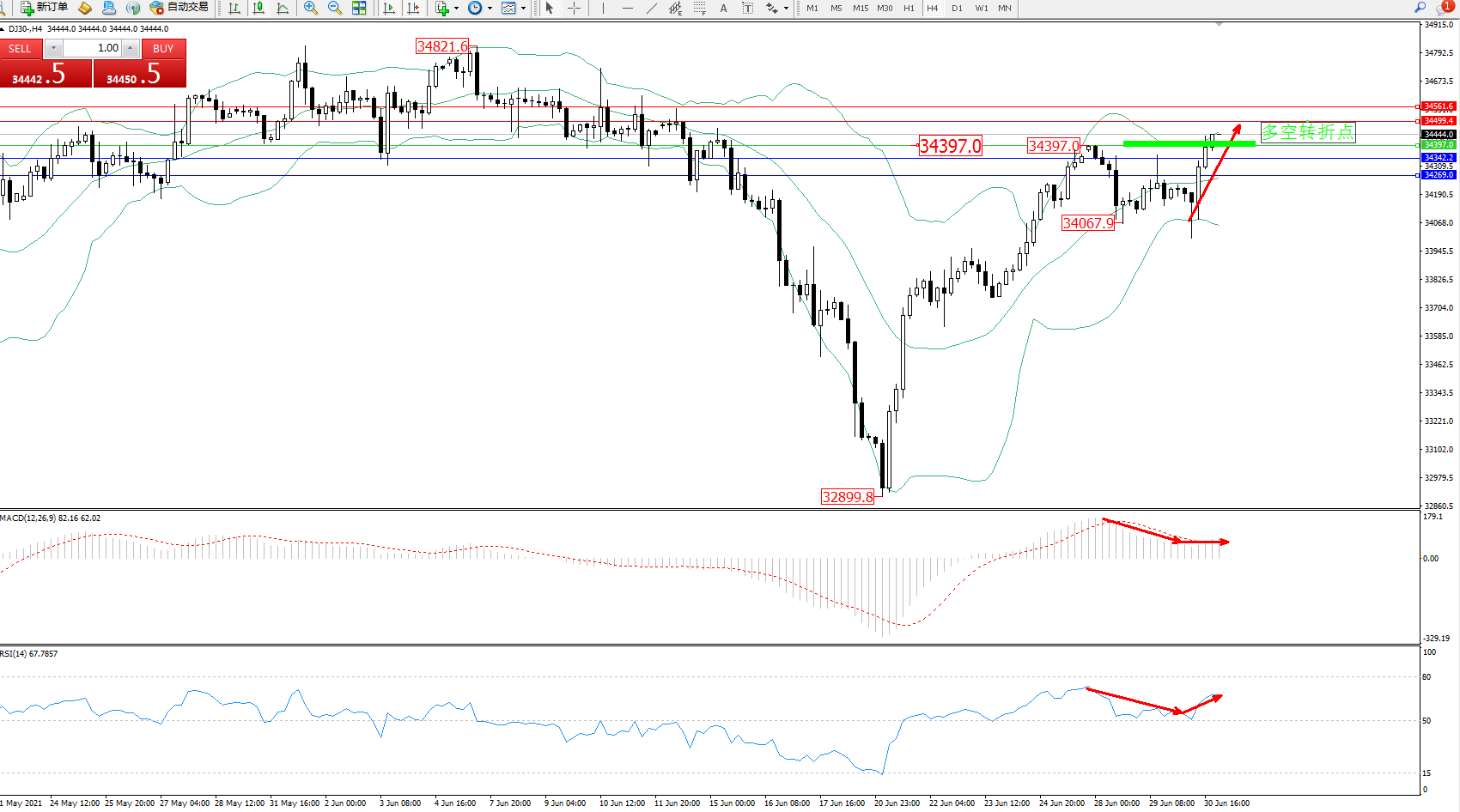 道琼斯指数DJ30——4小时K线图显示: