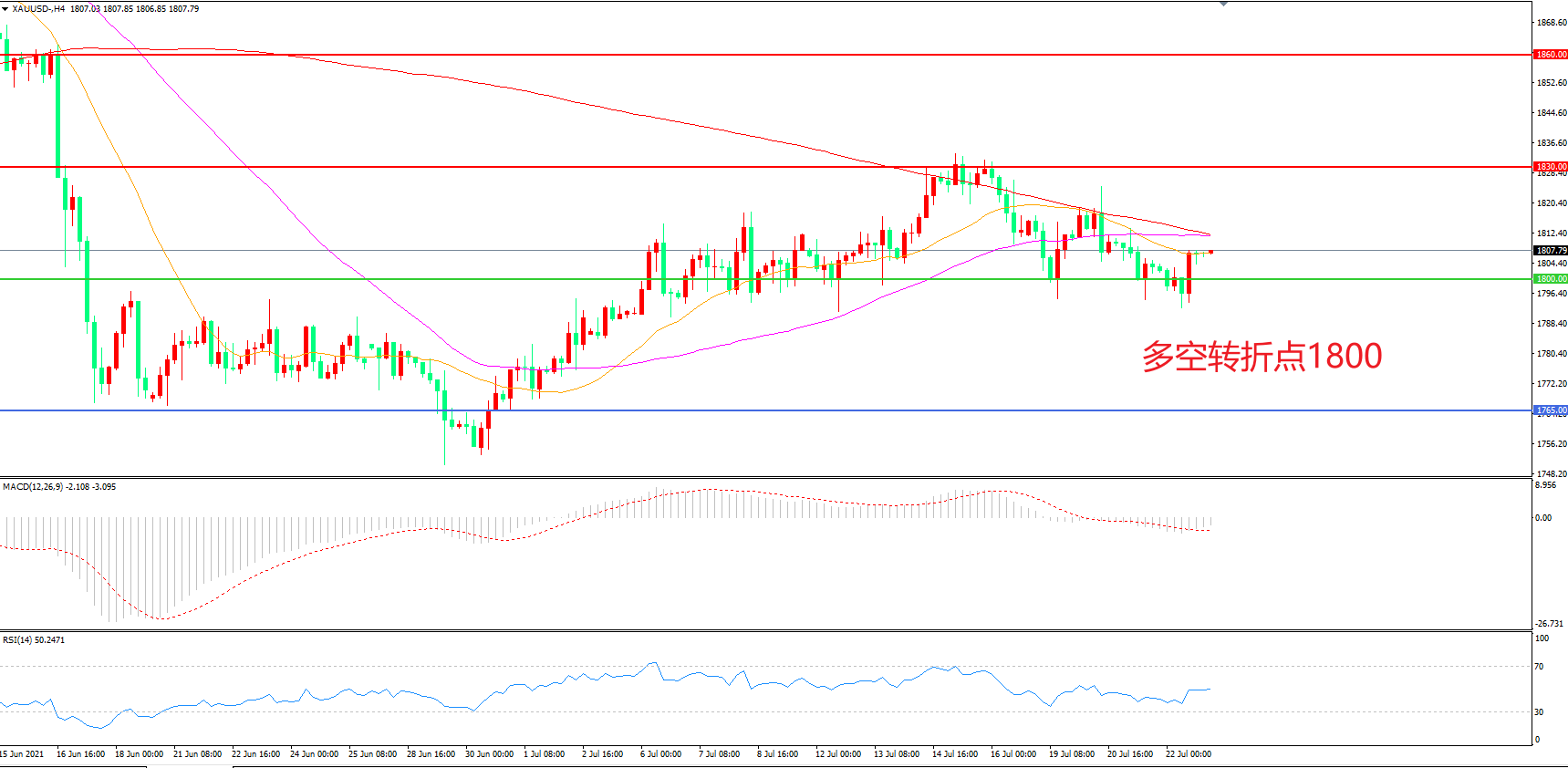 备选策略:在1800.00之下看跌,目标1760.00 1730.00