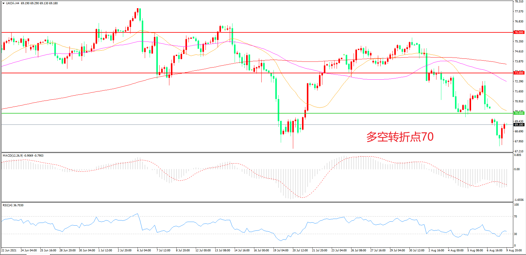 4小时图看,油价跳空低开后延续低位震荡,70美元成为短期多空分水岭,均线系统呈空头排列,MACD绿柱增加,RSI指标走平,日内震荡下行概率较大。