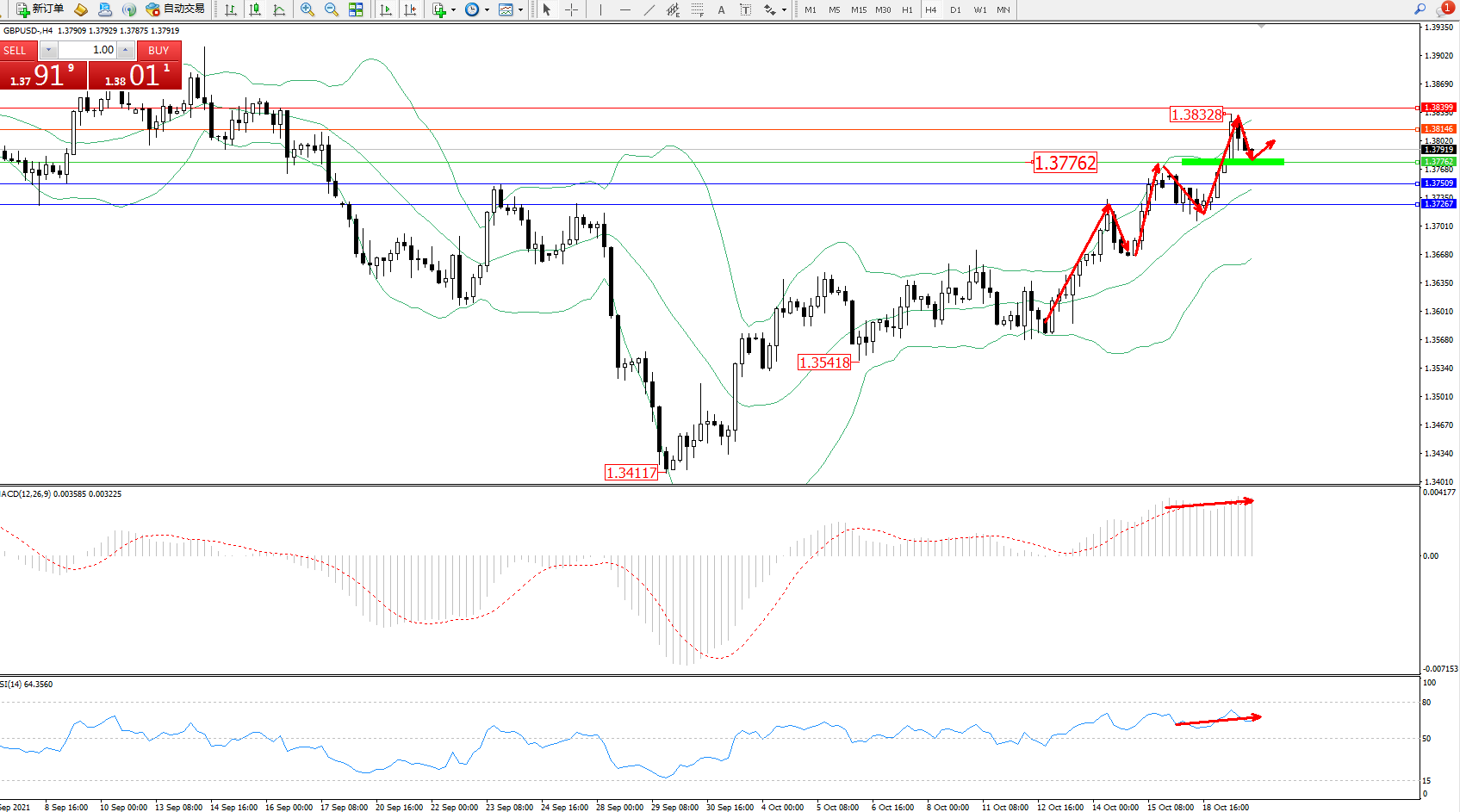 交易策略:1.37762上方看涨,目标1.38146、1.38399