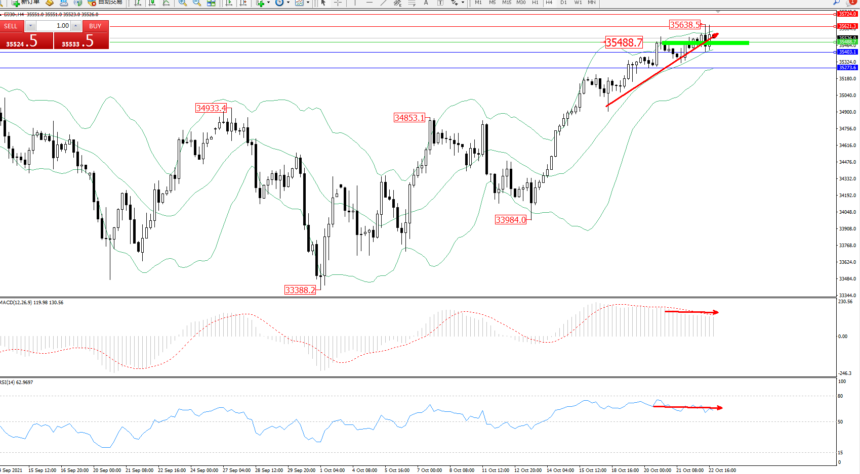 道琼斯指数DJ30——4小时K线图显示: