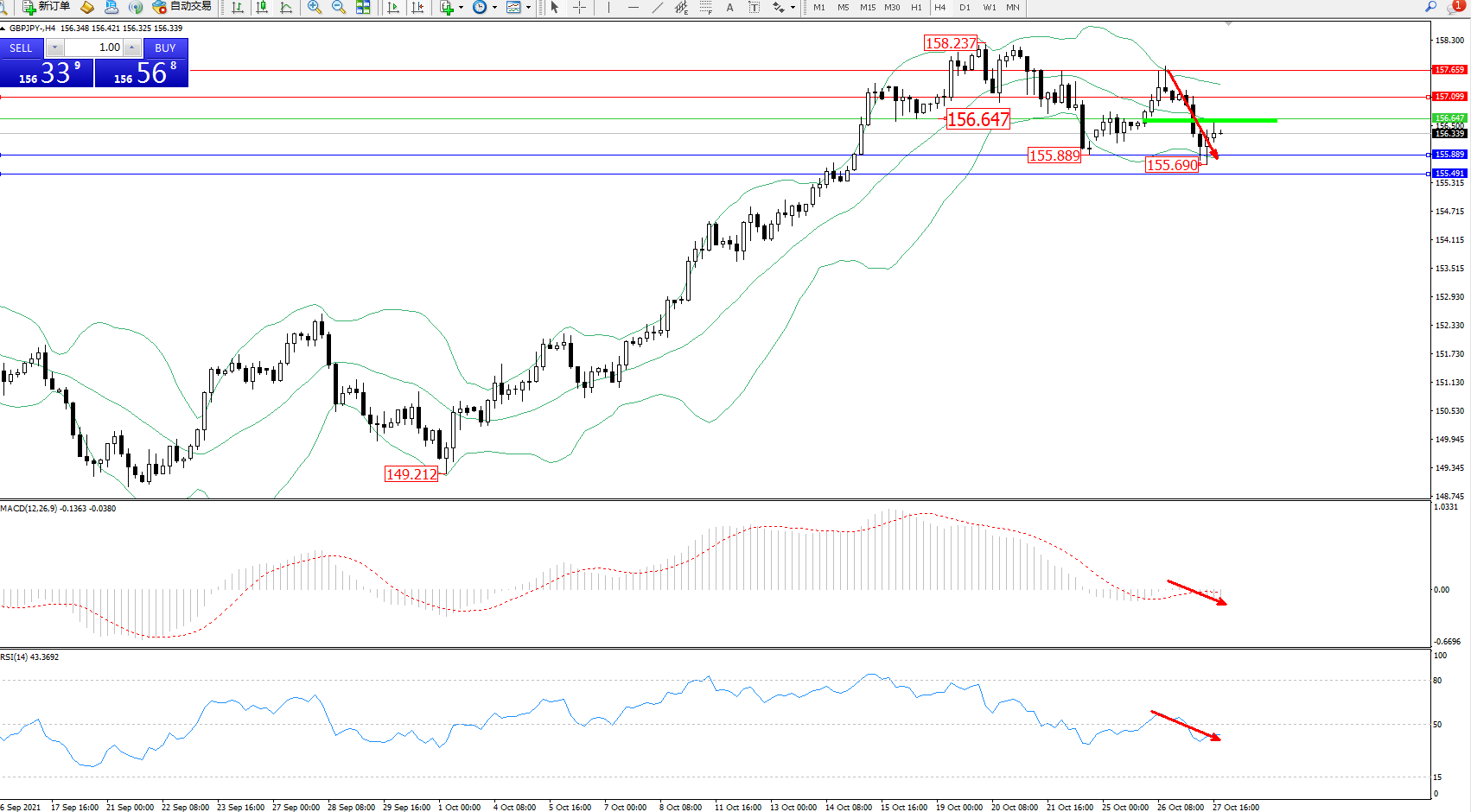 交易策略:156.647下方看跌,目标155.889、155.491