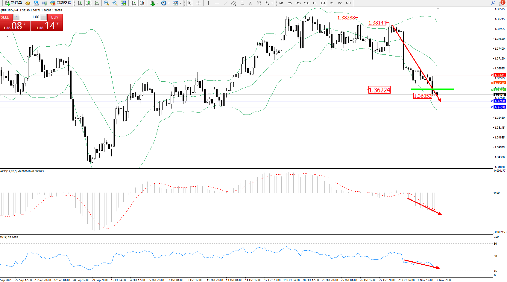 交易策略:1.36224下方看跌,目标1.35900、1.35730