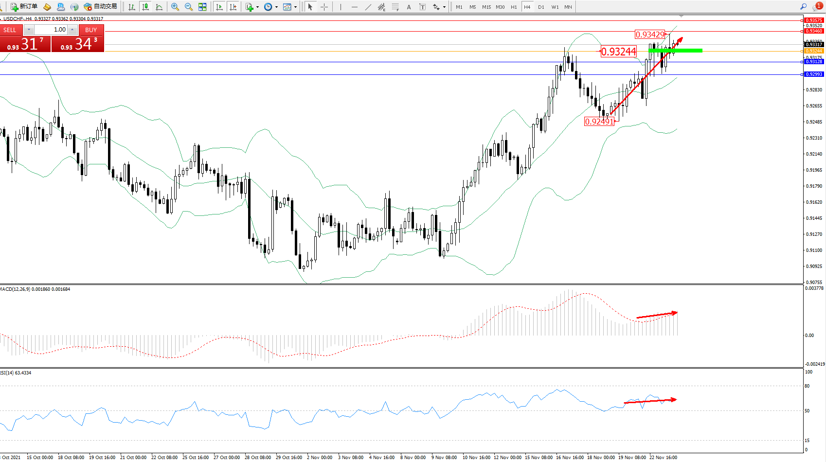 交易策略:0.93244上方看涨,目标0.93460、0.93575
