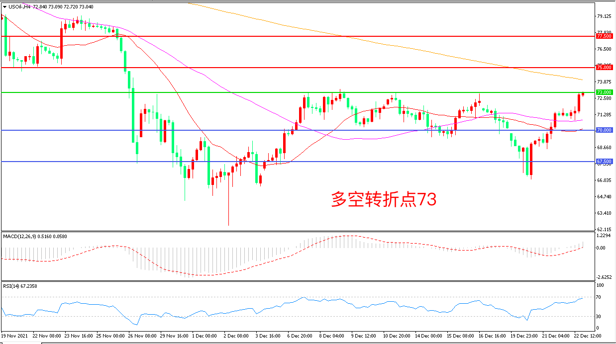 周三(12月22日),在寒冷天气席卷欧洲之际,能源市场又遭受新的供应面利空打击,天然气价格飙升带动能源价格整体反弹,美国WTI原油延续强势表现,收报72.97美元/桶。在昨天公布的EIA数据中,原油库存下降470万桶给了多头一定的信心,在欧洲能源危机愈演愈烈时,油价有望迎来爆发。