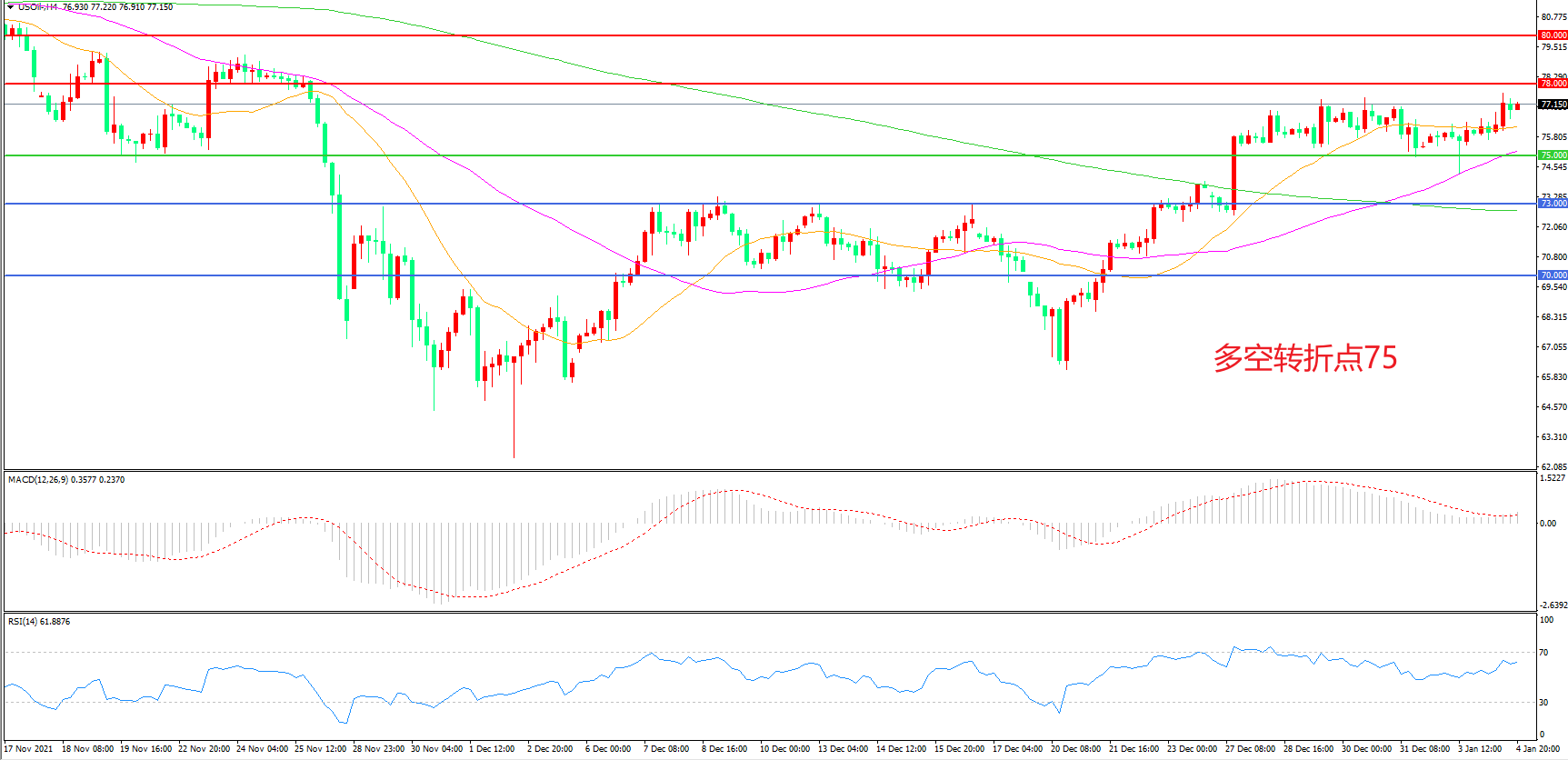 交易策略:在75.00之上看涨,目标78.00        80.00