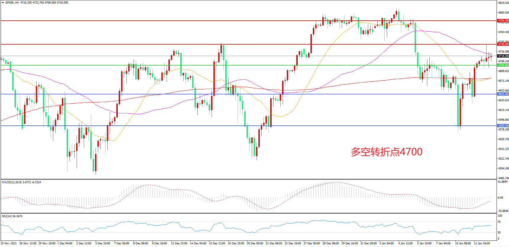 4小时图看,标普500近期连续反弹,短期走势有所回暖,4700成为多空分水岭,55周期均线成为上方阻力,MACD红柱增加,RSI指标走平,日内震荡上行概率较大。