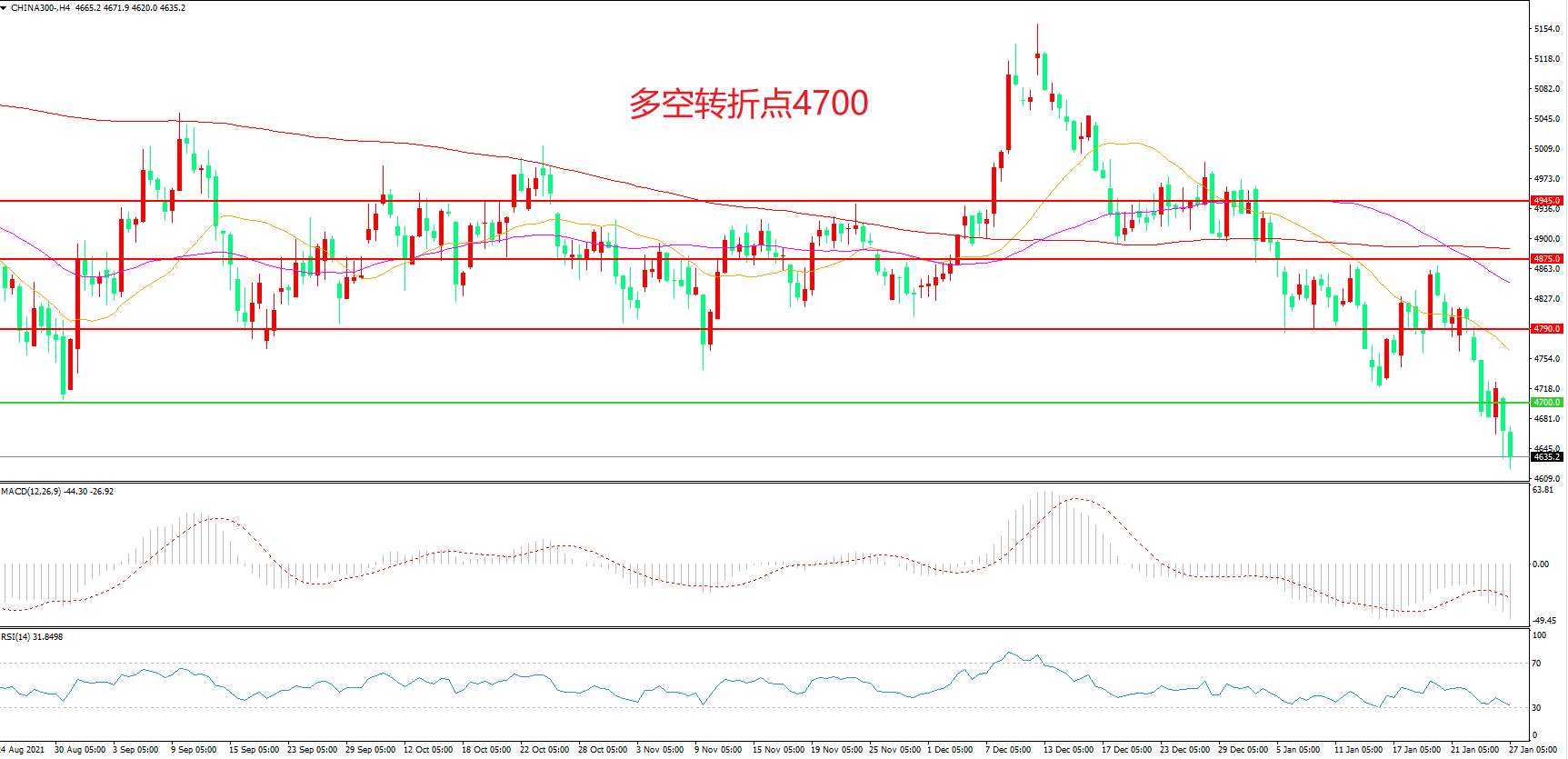 4小时图看,沪深300长阴连续下破,短期走势偏空,均线系统呈空头排列, 4700成为多空分水岭, MACD绿柱增加,RSI指标走平,日内震荡下行概率较大。