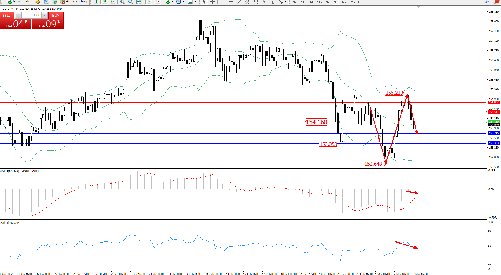 交易策略:154.160下方看跌,目标153.745、153.383