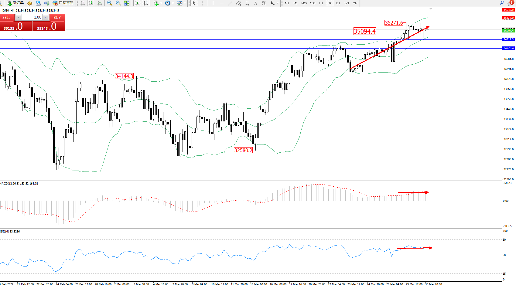 道琼斯指数DJ30——4小时K线图显示:
