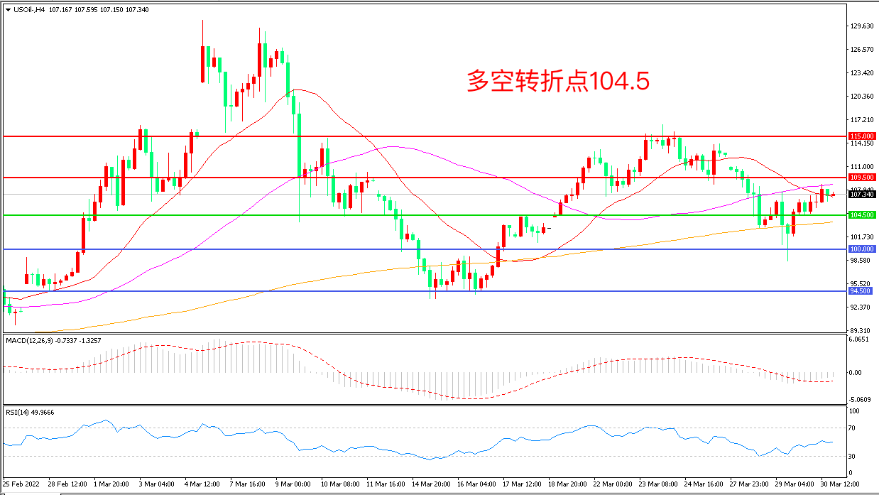 周四(3月30日),美国财政部在其网站上发表声明,宣布对伊朗施加新的制裁,伊朗原油回归市场的可能性再度成谜,美国WTI原油小幅走高,收报107.34美元/桶。目前,西方世界跟俄罗斯撕裂局面正在变得不可挽回,OPEC如果依然坚持原有的增产计划,油价的供应难题将难以解决,原油震荡偏强的格局将会持续。