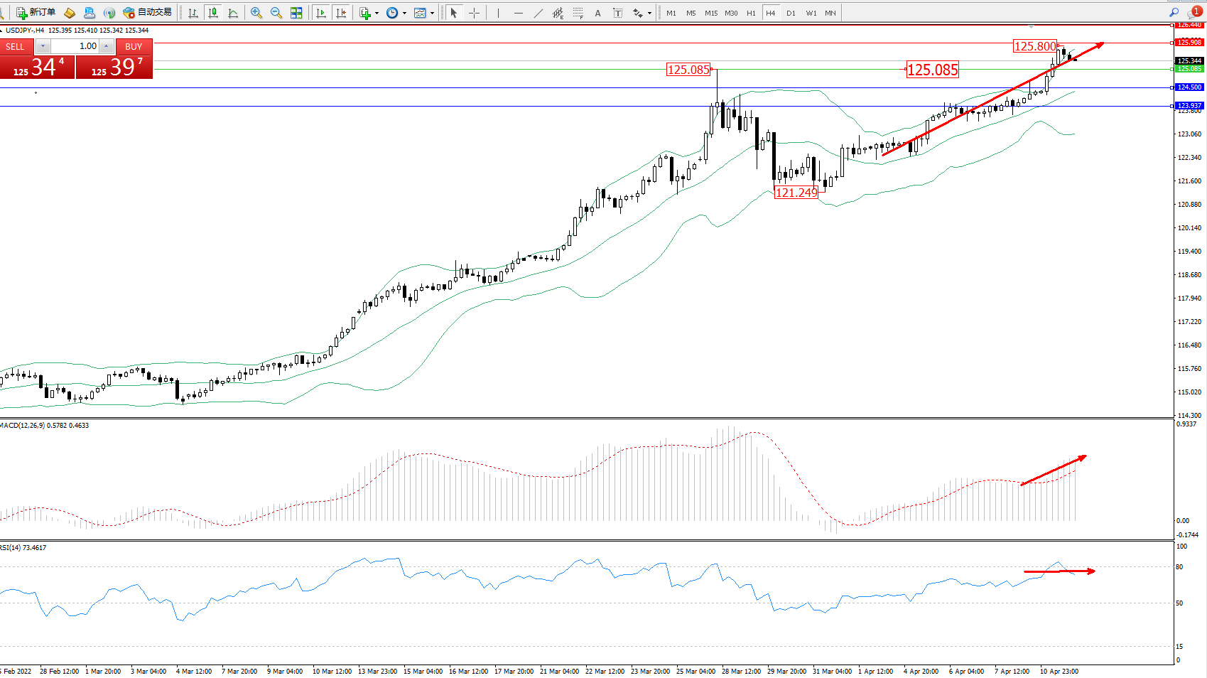 交易策略:125.085上方看涨,目标125.908、126.440