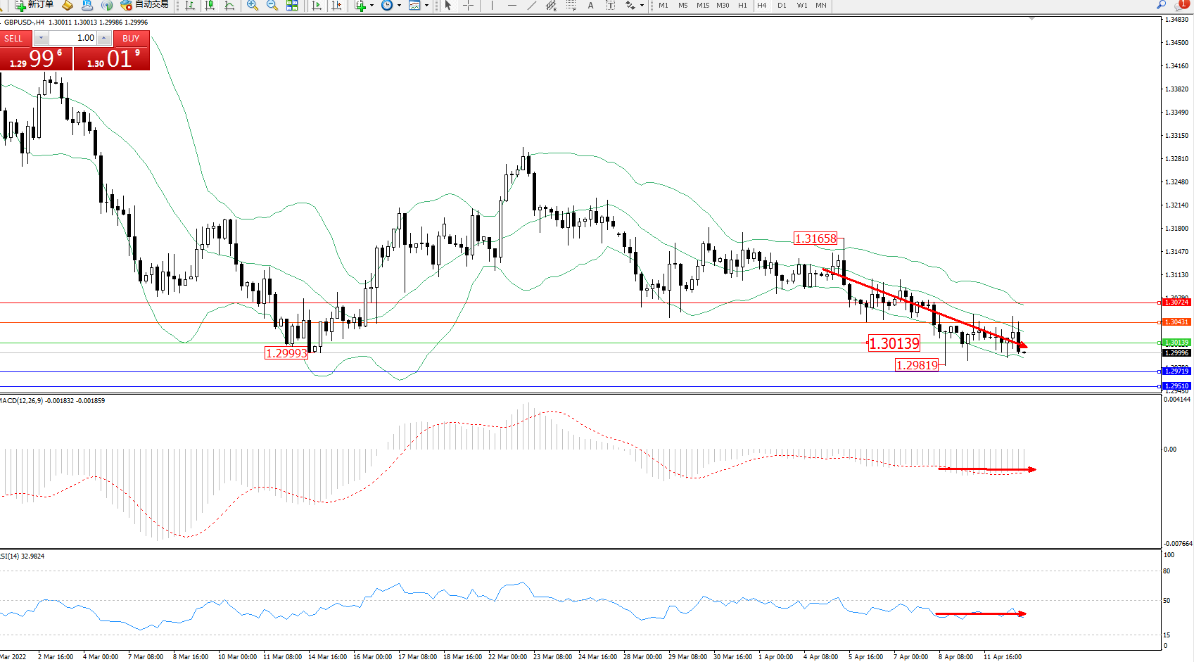 技术点评:空头动力延续布林带指标通道中下轨区间持续震荡下行,低位抵达1.29819位置节点后开始整理平移,短期空头动力有进一步向下移动态势,布林带指标呈向下移动趋势走势持续中,MACD指标处于空头区域维持整理平移中,RSI指标处于空头区域维持整理弱势徘徊中;