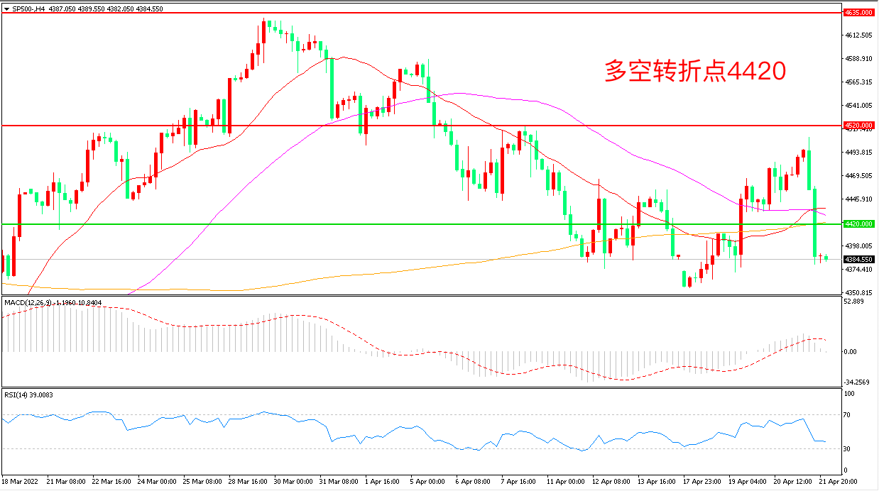 周四(4月21日),美联储主席鲍威尔称下次联储会议将讨论加息50个基点,本是鸽派的旧金山联储主席戴利同样发表鹰派表态,美联储高官的强势表态令激进加息的预期进一步升温,标普500长阴下破,收报4386点。流动性缩减的预期对投资者情绪形成了巨大压力,市场恐慌性踩踏后,短期美股走势仍然不容乐观。