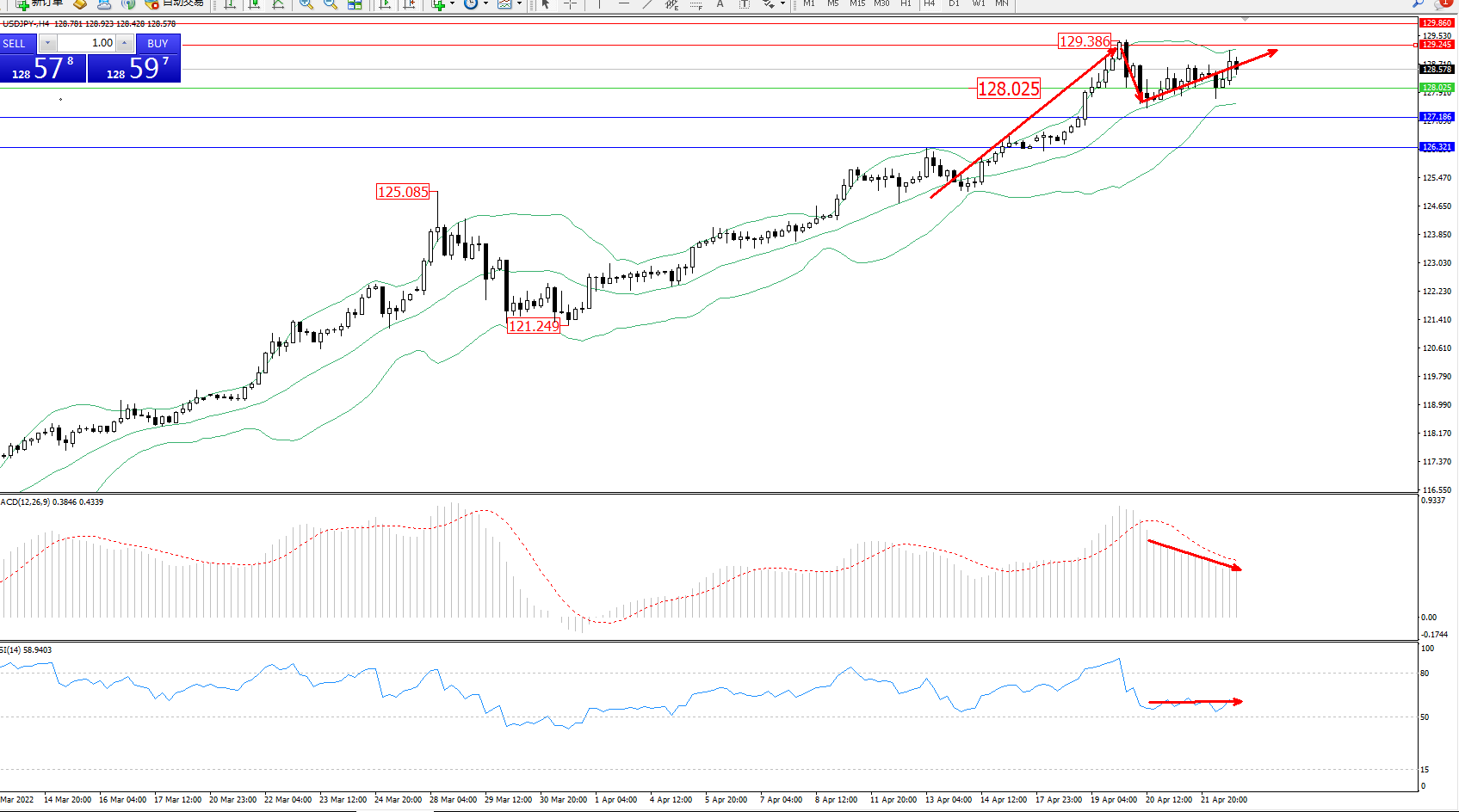 交易策略:128.025上方看涨,目标129.245、129.860