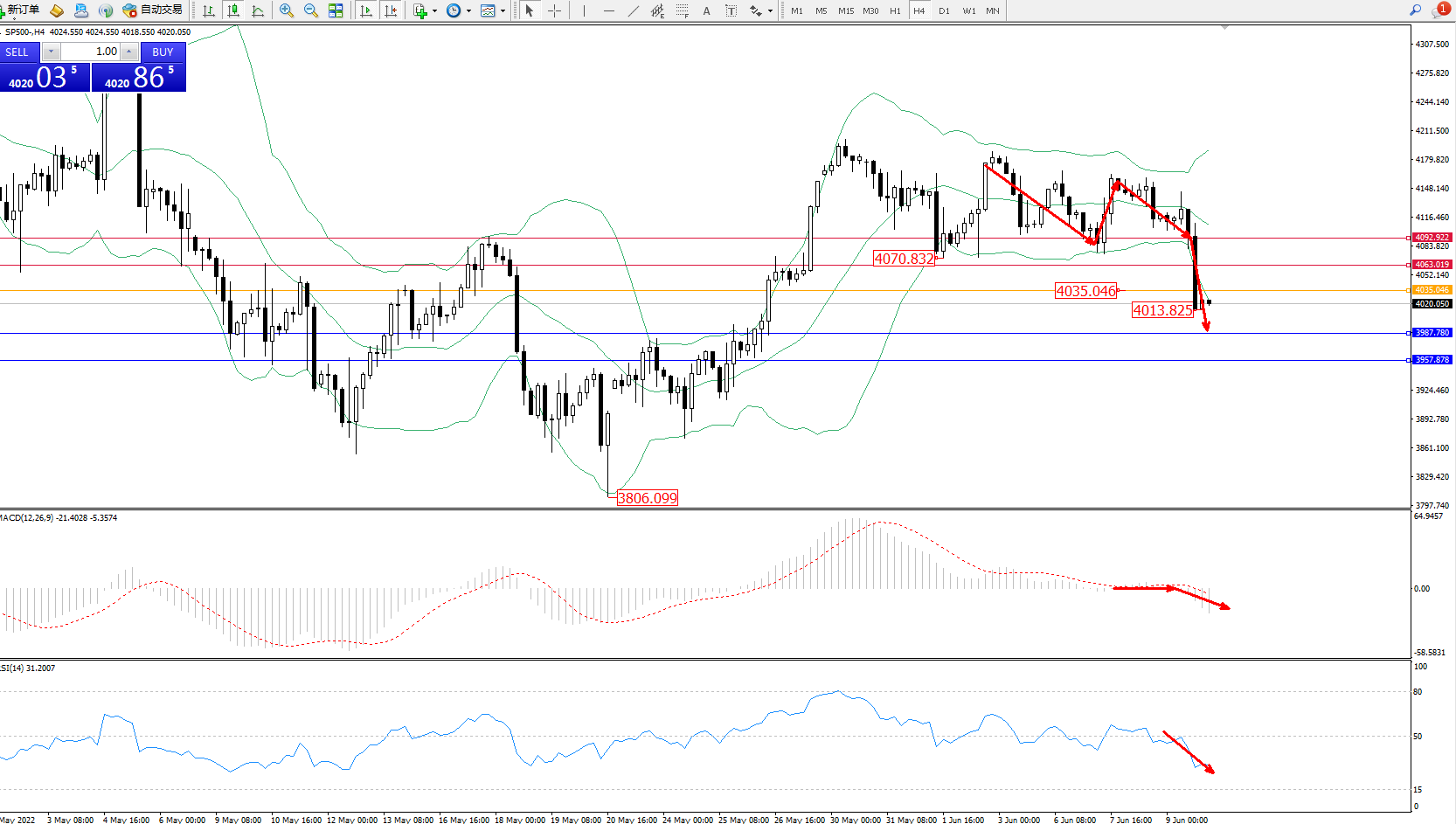 标普SP500——4小时K线图显示:
